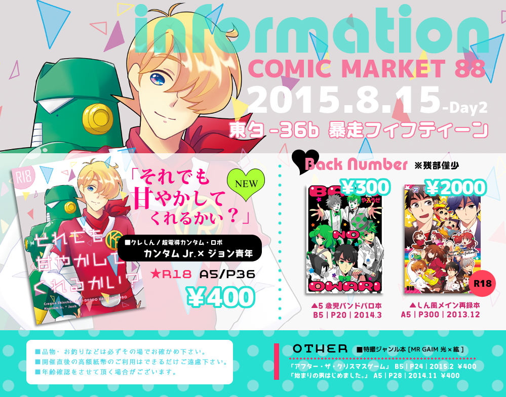 何より不安だったのは例えばしん風の時来てた方が今回サークル名だけ見て何も知らないまましん風あるかなってスペに来たとして「カ、カンタムロボ!?!」ってなるんじゃって思ったことです。私ならふつうにスペ前で硬直する。幸いそういう悲劇の瞬間を目にすることはなかったので思ったとしても口にも顔にも出さなかったみなさんの紳士的な対応にとても救われています…へへ…。むしろ来る方来る方すっごい自然にかつ威風堂々と新刊くださいって手に取っていってくださった。明らかに私だけが見えない敵と戦っていたんだ…