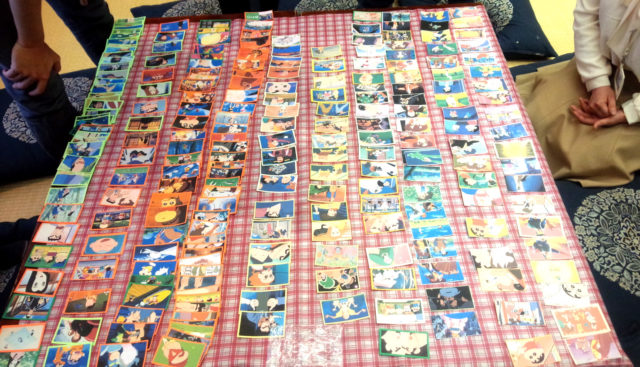 そして見よ、この暇を持て余した神々の遊び。片隅で粛々と行われていました…。写真逆からでちょっと見にくいけどカルタ終わったあと時系列順に並べて遊んでる人たちがいました。とても交ざりたかった。けっこうむずかしいよね。