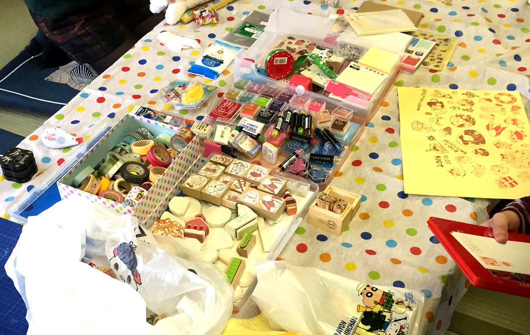 今回行われたポストカード作りにも参加しました。枚さんとぶりあやさんのイラストを元に鳴瀬さんが消しゴムはんこを作り、それを色とりどりのスタンプにしてX’masカードや年賀状を作ろうぜ!というコーナーです。その情景を今思い返したら工作中のひまわり組の教室みたいでかわいいって思った。とにかくはんこもインクもシールなどの装飾物もいっぱいあってどれもかわいくってすっごく迷った!